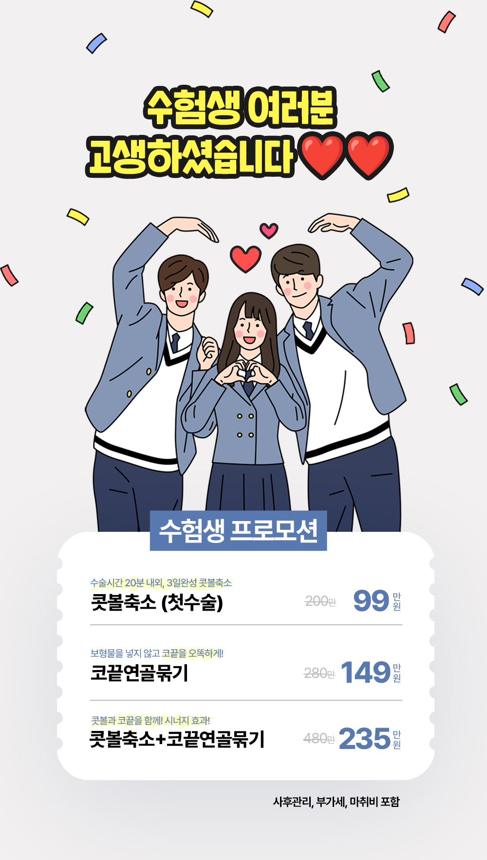수험생 한정 특가 이벤트✨ 페이지 정보 작성자 라이즈성형외과 진행중 이벤트기간 : 2025-10-27 ~ 2026-02-28 목록 본문 목록 01.jpg (321.1K) 0회 다운로드 02.jpg (468.5K) 0회 다운로드